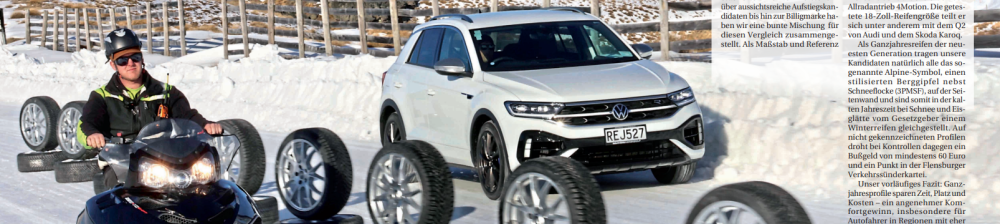 Auto Bild SportsCars, Ekim ayında ikinci dört mevsim lastik testini yayınladı ve 215/50 R 18 ebatındaki on lastiği değerlendirdi. Test, Continental, Pirelli ve Goodyear gibi köklü premium üreticilerden Linglong ve Fortuna'nın uygun fiyatlı ürünlerine kadar uzanan ürünleri kapsıyordu. Tüm testler, 300 PS turboşarjlı motor ve 4Motion dört tekerlekten çekiş sistemiyle donatılmış bir VW T-Roc R kullanılarak gerçekleştirildi.