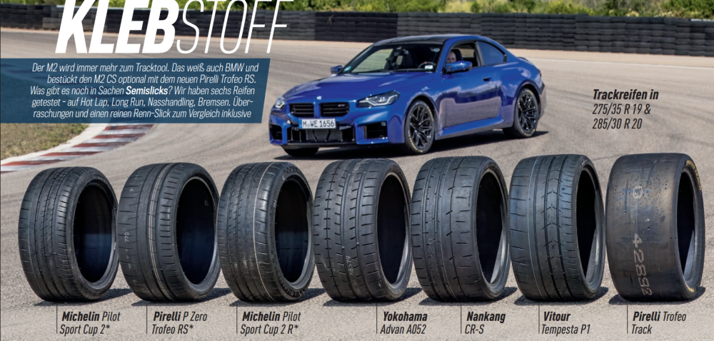Auto Bild Sportscars, bir BMW M2'ye takılan 275/35 R19 ve 285/30 R20 ebatlarında beş adet yarı slick pist lastiğini test etti. Standart Michelin Pilot Sport Cup 2 (BMW işaretli) referans olarak kullanılırken, Pirelli slick lastiği de yarış dışı bir karşılaştırma olarak dahil edildi. Testler, İtalya'daki Vizzola ve Nardò pistlerinde ıslak zeminde yol tutuşu, ıslak zeminde frenleme, kuru zeminde frenleme, hızlı tur ve dayanıklılığı değerlendirmek için altı turluk uzun bir sürüşü kapsayacak şekilde gerçekleştirildi.