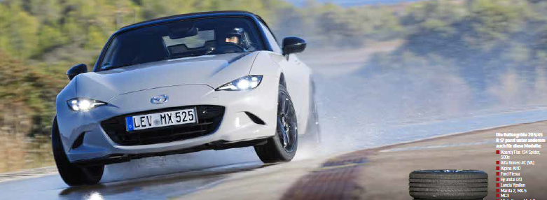 Alman Sport Auto dergisinin 4/2026 sayısında, Mazda MX-5 üzerinde 205/45 R 17 ebatındaki yedi yaz lastiği test edildi. Test edilen lastikler arasında premium spor, touring ve ekonomik seçenekler yer aldı: Bridgestone Potenza Sport evo, Goodyear Eagle F1 Asymmetric 6, Falken Azenis FK520, Continental PremiumContact 7, Michelin Pilot Sport 5, Linglong Sport Master ve Firestone Roadhawk 2. Lastikler, ıslak ve kuru zemin performans testlerinin yanı sıra konfor ve verimlilik açısından da değerlendirildi.
